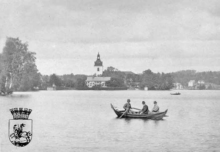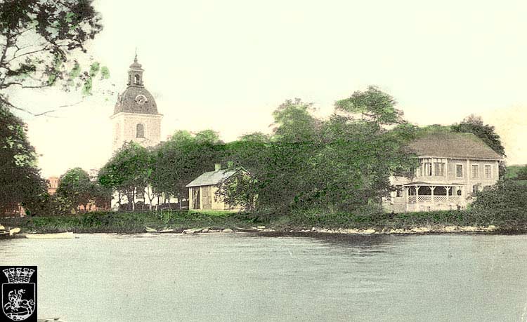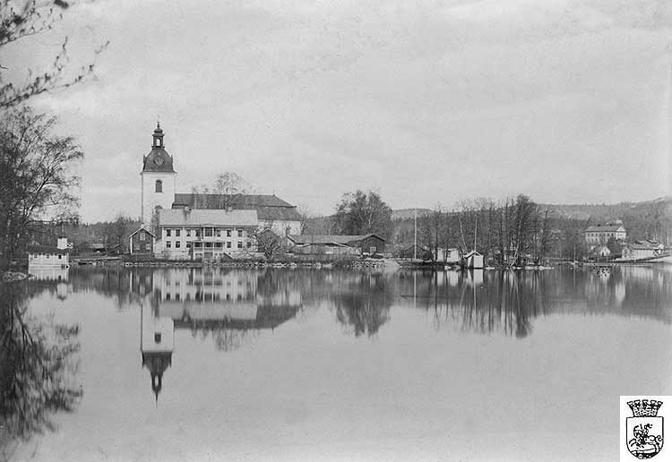 bruksägare på udden intill kyrkan. Till vänster skymtar järnstaketet kring kyrkogården. Bilden från Filipstads Gilles bildarkiv.