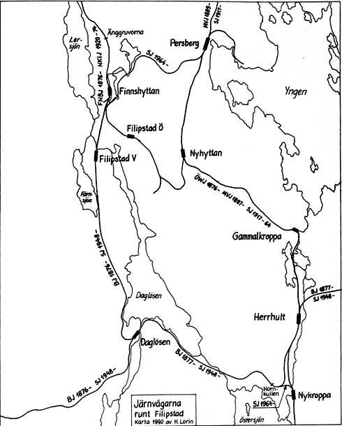 - Filipstads Järnväg. Banan ledde från Storbro hytta till Filipstads hamn och följde i stort nuvarande Malmgatan. Öppnades 1853 och överläts samma år till Yngs – Daglöse järnväg. Spårvidd 692 mm.