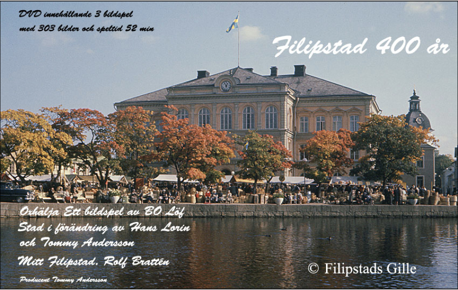 ![]() ![]() | Filipstad 400 år. Som bekant fyllde Filipstad 400 år under 2011. Det firas med att Filipstads Gille sammanställt 3 olika bildspel som väl skildrar tiden från det att staden fyllde 350 år fram till våra dagar. Den totala speltiden är 52 minuter och innehåller inte mindre är 303 bilder.Det första bildspelet handlar om Sveriges största marknad, Oxhälja, med bilder från 1960-talets början fram till och med 2010. Bilderna är producerade av Bengt Olof Löf.Det andra bildspelet kallas Stad i förändring och skildrar Filipstads utveckling från 1960-talet. De nytagna bilderna är fotograferade av Hans Lorin och Tommy Andersson.Tredje bildspelet visar vilken vacker stad Filipstad är. Rolf Brattén visar bilder tagna under 2010. Beställningsnummer fg06. PRIS 150 kr + porto |