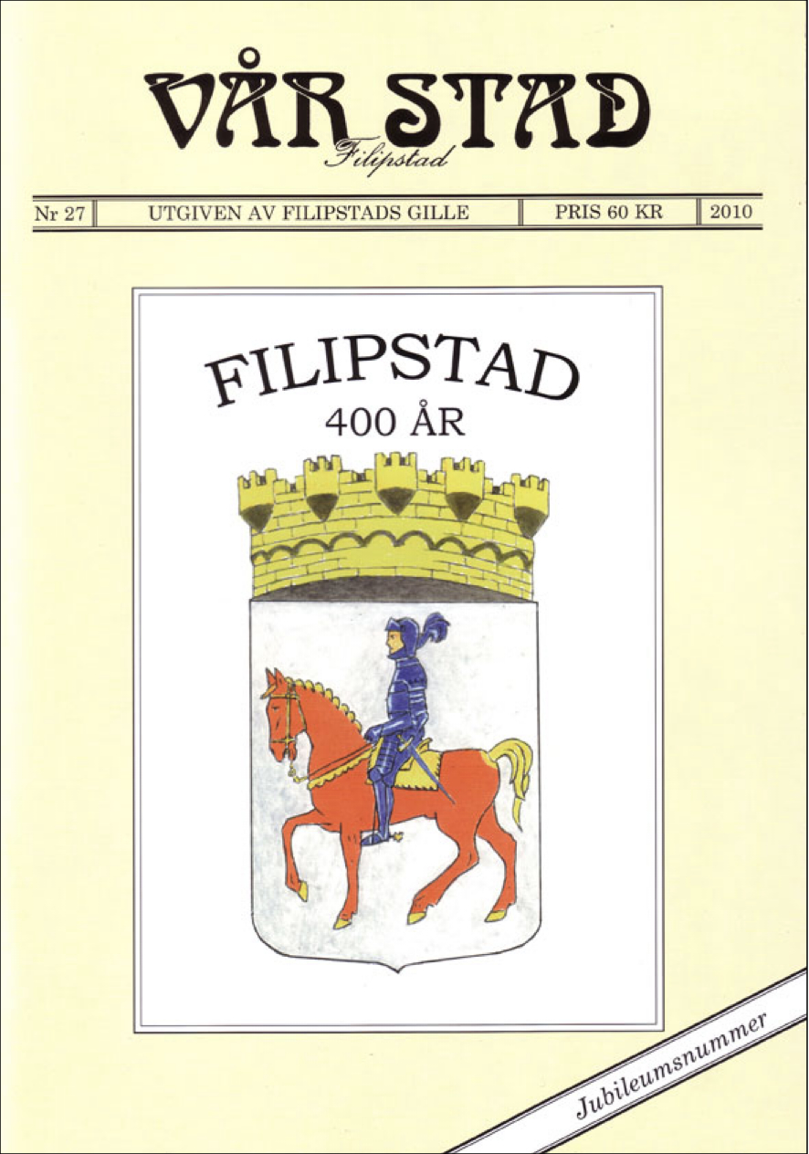 ![]() ![]() | Nr 30 – 2013 Redaktör´ns tankar ; Hans Lorin Filipstads bergslag fyller 600 år – 1413-2013; Rolf Brattén Sex bilder på vägen till Nidaros; Hans Löfgren Sången vid Skaterud; Bertil Johansson Jonny Nilsson världsmästare i skridsko; Einar Lidberg Ensam är stark; Einar Lidberg Några personer i 1600-talets Filipstad; Anita Carlstedt Syskonen Jaakkola – finska krigsbarn i Filipstad; Roland Nilsson Hur gammal är Filipstadstrakten egentligen? ; Curt Fredén Genom Wermlands; Pelle Räf Filipstad för 50 år sedan – 1964 ; Einar Lidberg Ett helt gäng är årets kulturprofiler ; Rolf Mårth Gillesnytt ; Hans Lorin Några bilder från tidigt 1970-tal; Lars Erik Jansson | Filipstads Gilles tidskrift ”Vår Stad 2013”.Pris 30 kr + porto. OBS! PRISSÄNKT Beställningsnummer vs30. |