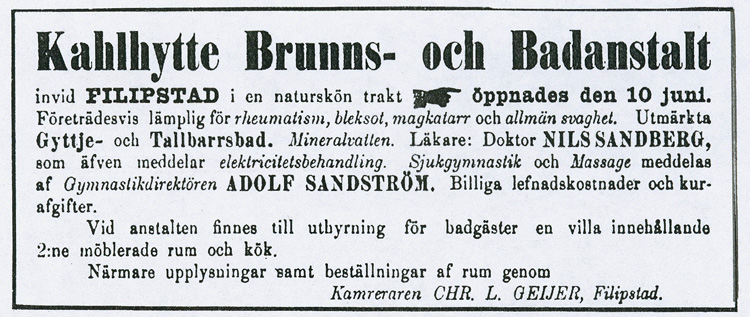för personer behäftade med ”rheumatism, bleksot, magkatarr och allmän svaghet”. Dr Nils Sandberg – anstaltens läkare – var under lång tid