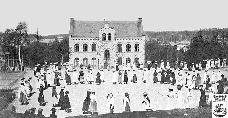 1910 hade elevantalet ökat så stark, att det var dags att bygga till skolhuset, dels på gavlarna, dels på höjden med en komplett tredje våning. Det är väl det utseendet vi alla minns skolan. Skolhuset var en pampig byggnad med sina tre våningar. Det hade sin huvudingång på norrsidan, åt Allégatan, men f.d. elever och andra minns säkert bäst de tre ingångarna på sydsidan, från skolgården. Tre väldiga trappor ledde upp till de olika planen med klassrum och andra lokaler. Många av oss kommer säkert ihåg de nedslitna trappstegen av kalksten, i vilken otaliga ortocerariteter sov sin mångniljonåriga sömn. Ett stort lärarrum fanns på mellanvåningen åt norr. På översta våningen var bl.a den mäktiga samlingssalen, en sal för träslöjd och gymnastiksal med omklädningsrum. En tid fanns även en sal för syslöjd på samma våning. Det var högt i tak i alla salar, och de stora fönstren släppte in massor med dagsljus. Rummen åt norr var lite svala på vintern, men åt söder var de desto varmare under våren och hösten, när solen brassade på.